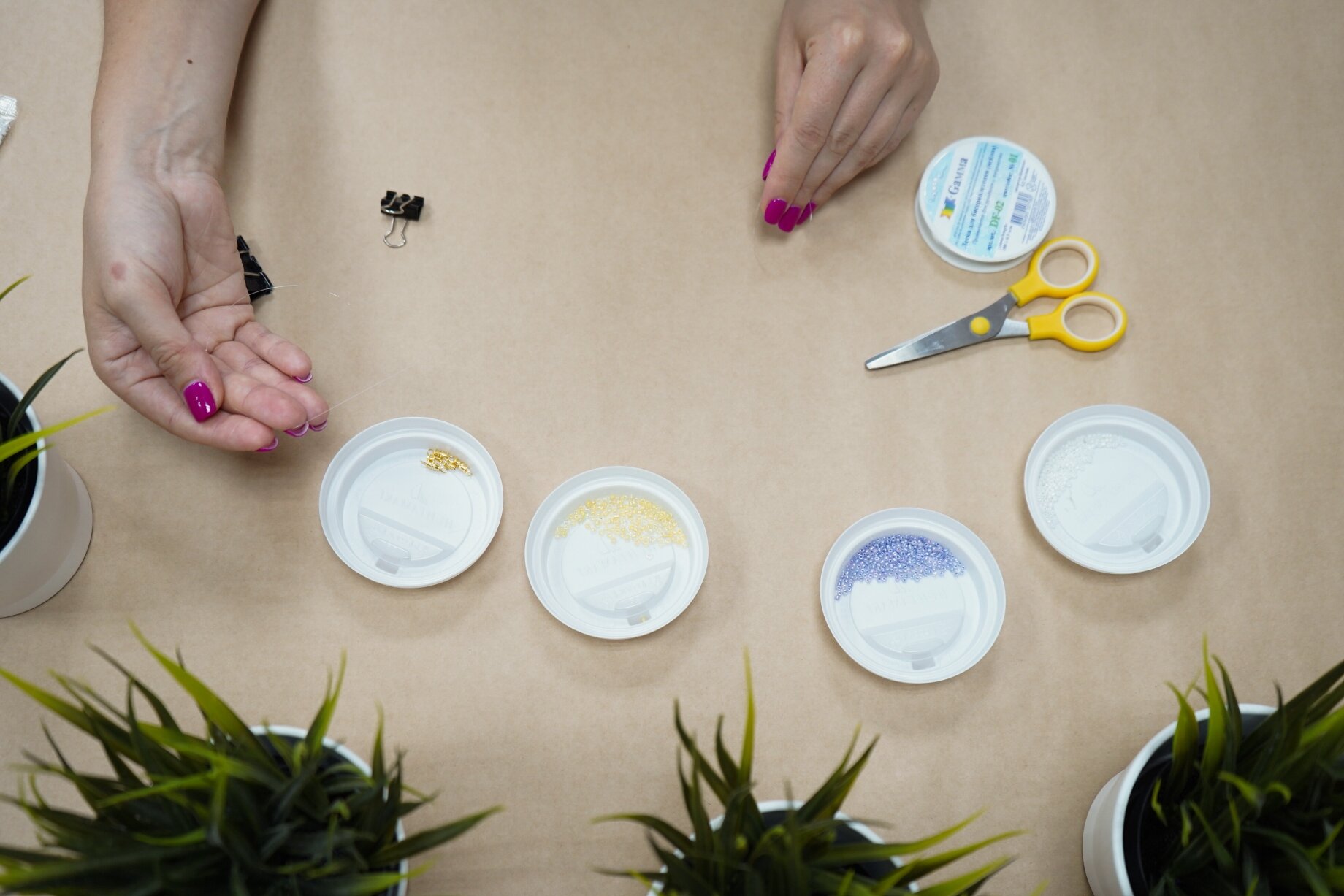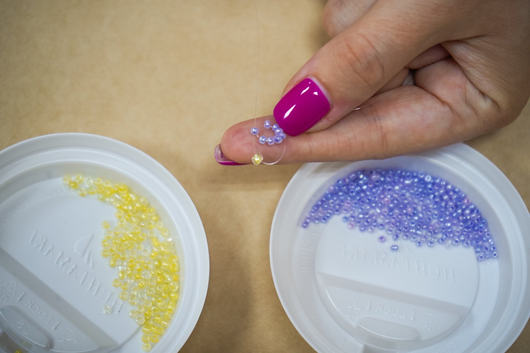 Мы будем использовать бисер трёх разных цветов: фиолетовый и белый для лепестков, жёлтый для серединки. Высыпаем бисер каждого цвета в любые плоские ёмкости. У нас это крышки от кофейных стаканов.