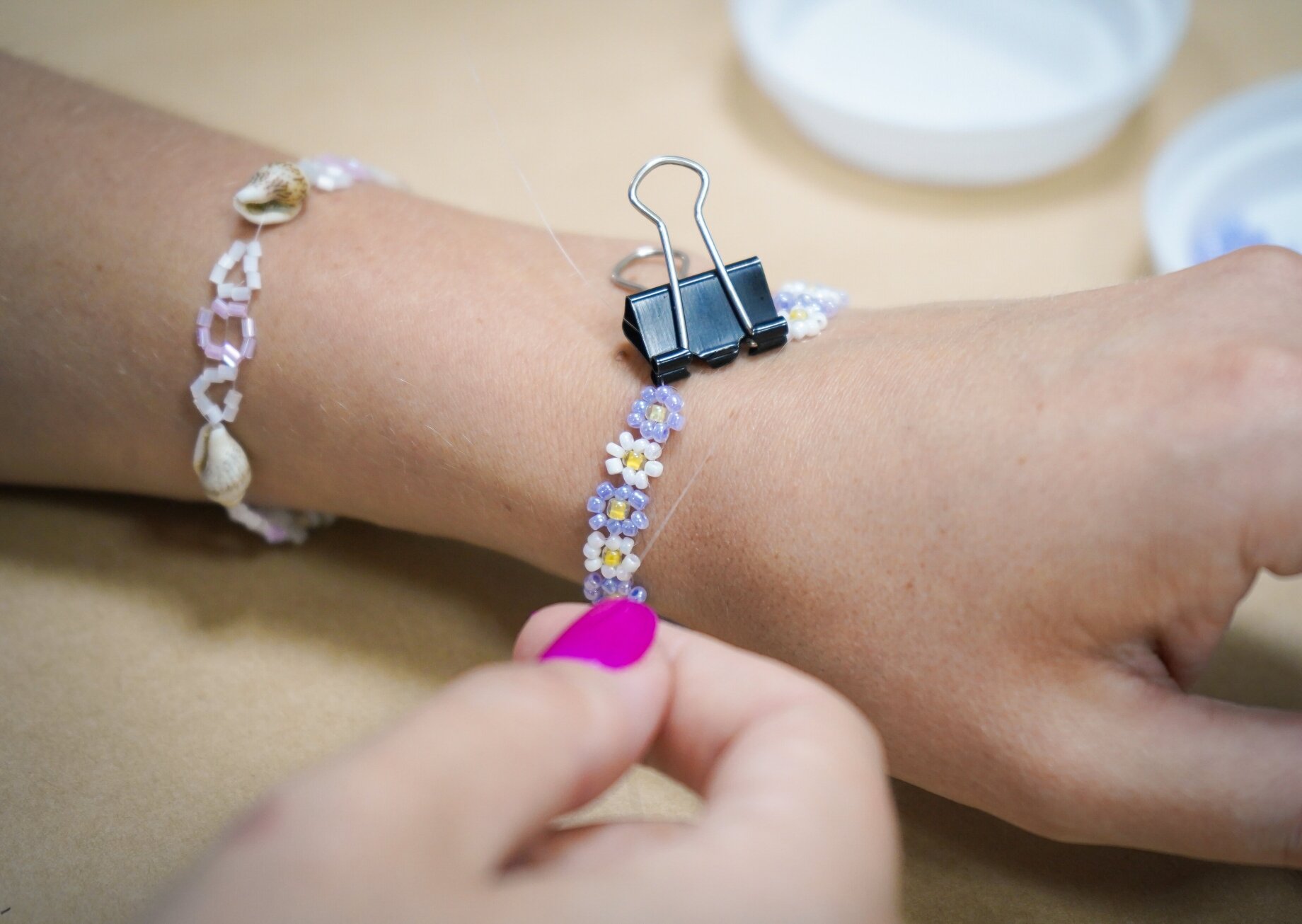 Подтягиваем леску и закрепляем зажимом, чтобы первая ромашка не распустилась во время плетения браслета