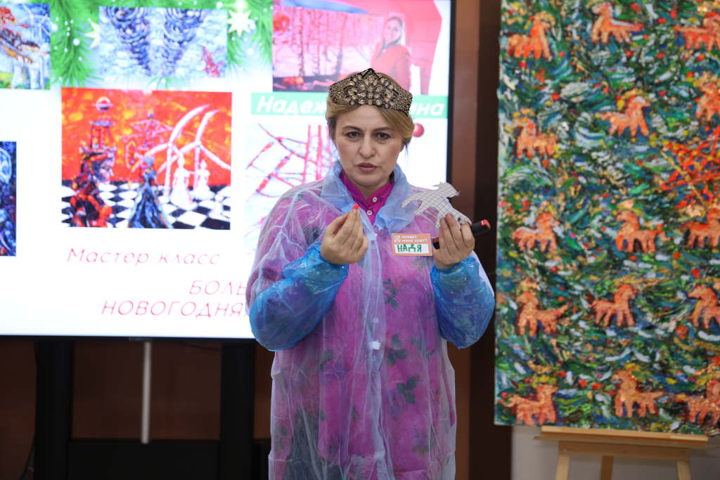 Специально для мастер-класса Надежда заранее создала фактурную картину с символами наступающего года. Она стала наглядным примером и помогла юным художникам увидеть разнообразие оттенков и вдохновиться на создание собственных живописных работ.