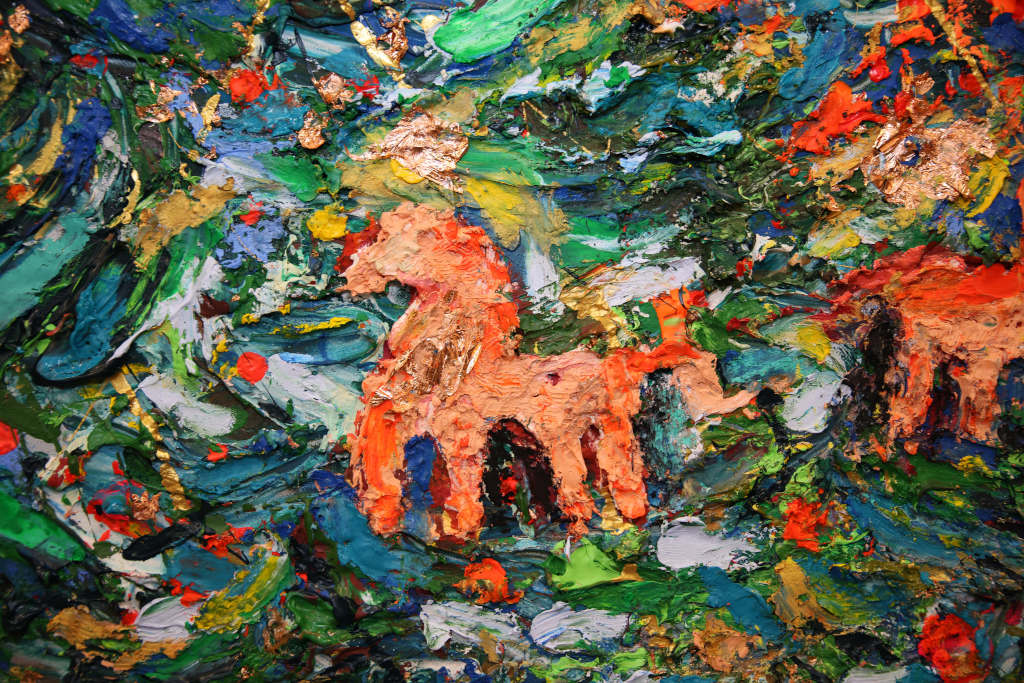 Идея проекта состояла в том, чтобы из очень разных работ детей создать тематическую открытку с изображением новогодних ёлок и сказочных лошадей — большой холст из небольших фрагментов, который наполнит участников ощущением праздника. На занятии дети научились видеть объём, смешивать цвета, работать с различными материалами и написали свои произведения.