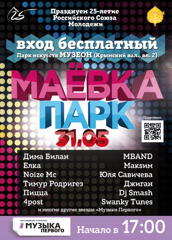 31 мая в парке искусств «Музеон» в Москве (ул.Крымский вал, вл.2) по инициативе Российского Союза Молодежи (РСМ) впервые пройдет молодежный фестиваль «Маёвка». С 11.00 гости столичного парка смогут бесплатно поучаствовать в празднике под открытым небом. Всех желающих ждут развлечения и приятные сюрпризы.