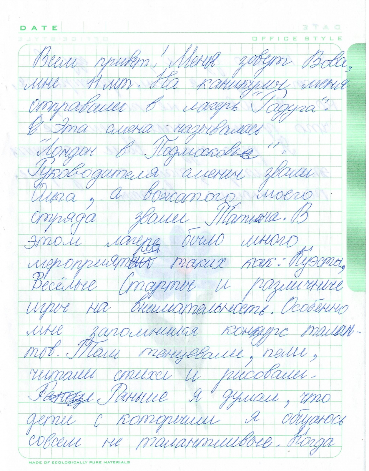 «Всем привет! Меня зовут Вова, мне 11 лет. На каникулы меня отправили в лагерь «Радуга». Эта смена называлась «Лондон в Подмосковье».