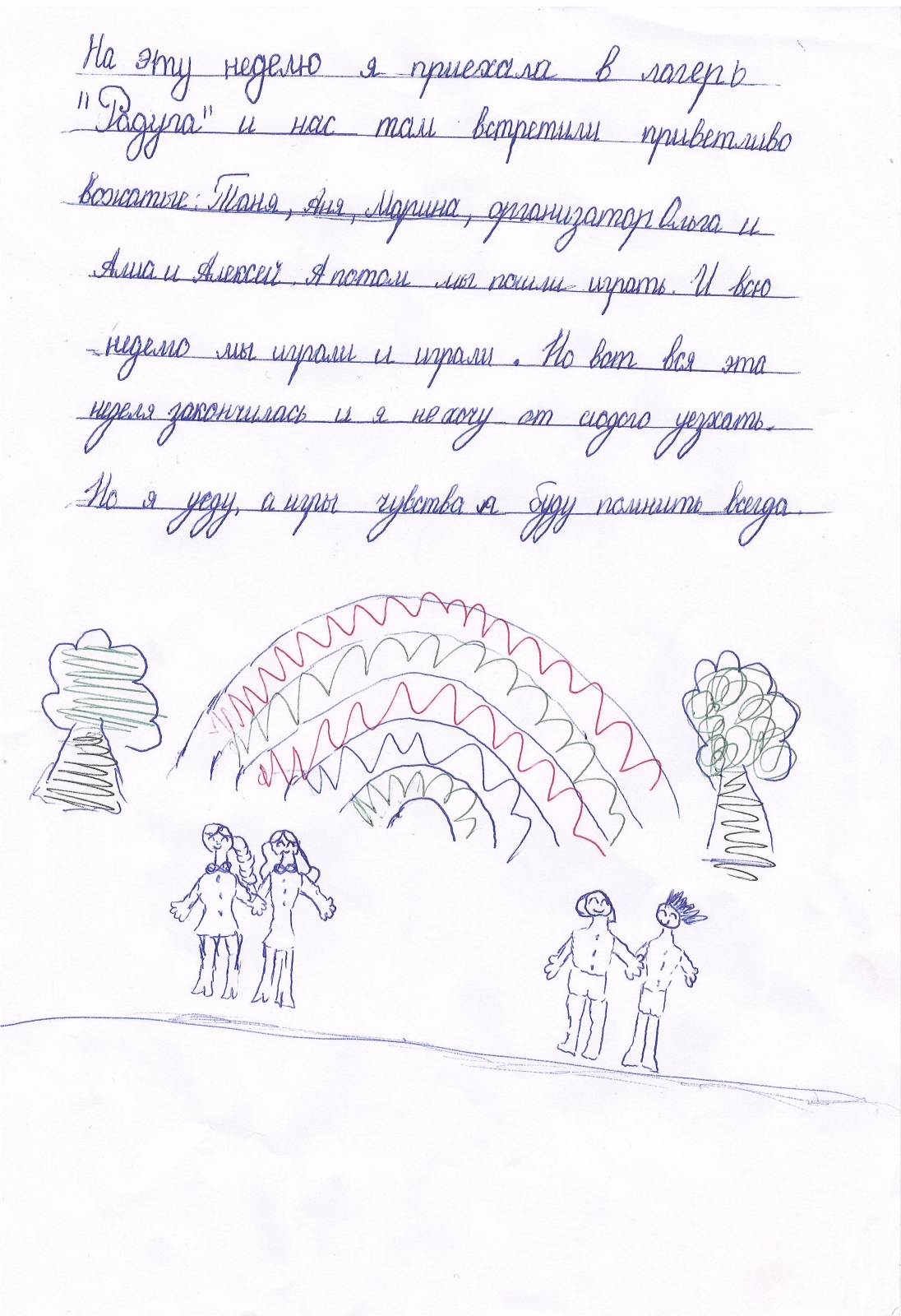 Руководителя смены звали Ольга, а вожатого моего отряда звали Татьяна. В этом лагере было много мероприятий таких как: Квесты, Весёлые старты и различные игры на внимательность. Особенно мне запомнился конкурс талантов. Там танцевали, пели, читали стихи и рисовали. Раньше я думал, что дети, с которыми я общаюсь, совсем не талантливые.