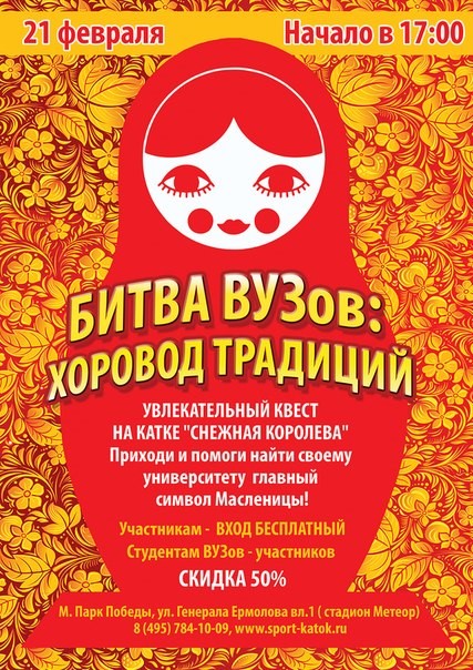 Межвузовское первенство «Битва ВУЗов: Хоровод Традиций», посвящённое празднованию Масленицы проводится под эгидой Сети ледовых катков «Новая Лига» и при поддержке Департамента физической культуры и спорта города Москвы.