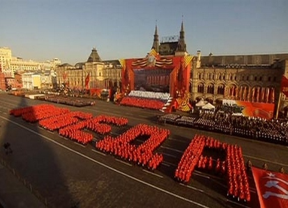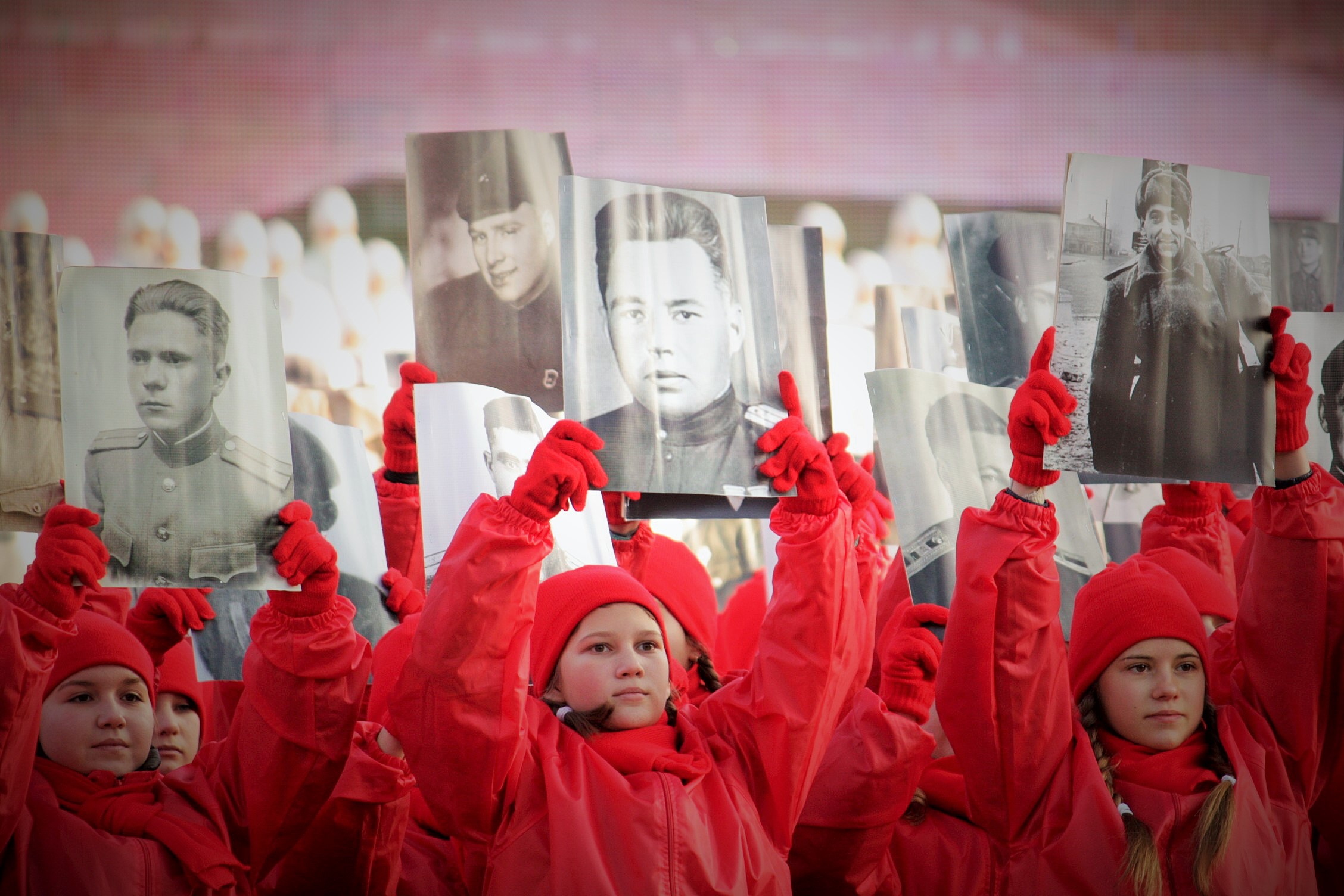 После инсценировки отправления солдат на фронт, вместе с вожатыми МОСГОРТУРа дети выстроились в огромное слово «Победа», что стало яркой кульминацией марша. В руках подростков — фотографии павших в Великой Отечественной войне героев.
