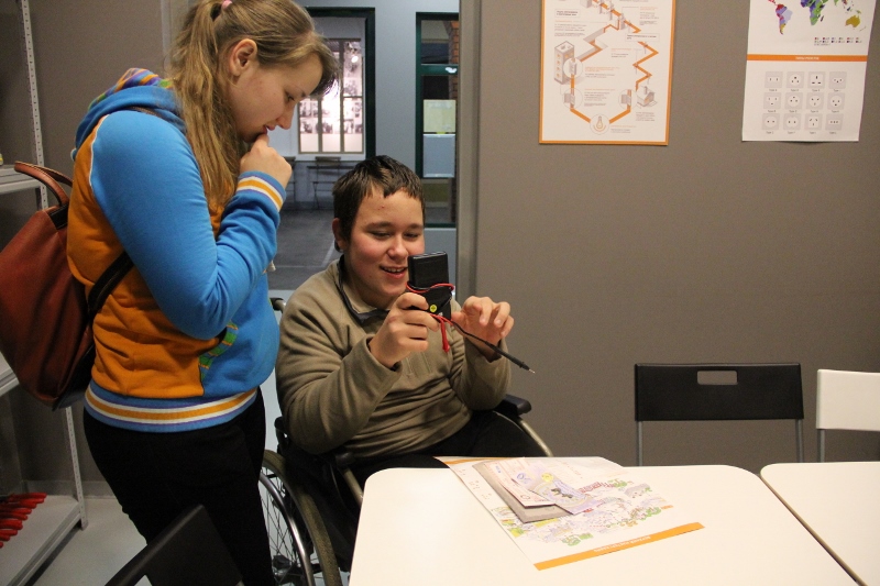 Началось все с изучения тонкостей электронапряжения и видов электро-розеток разных стран. На мастер-классе юноша вместе с другими обычными детьми внимательно слушает наставника. Дети без каких-либо «косых» взглядов в сторону Коли дружно отвечают на вопросы наставника и рассматривают разноцветные провода.