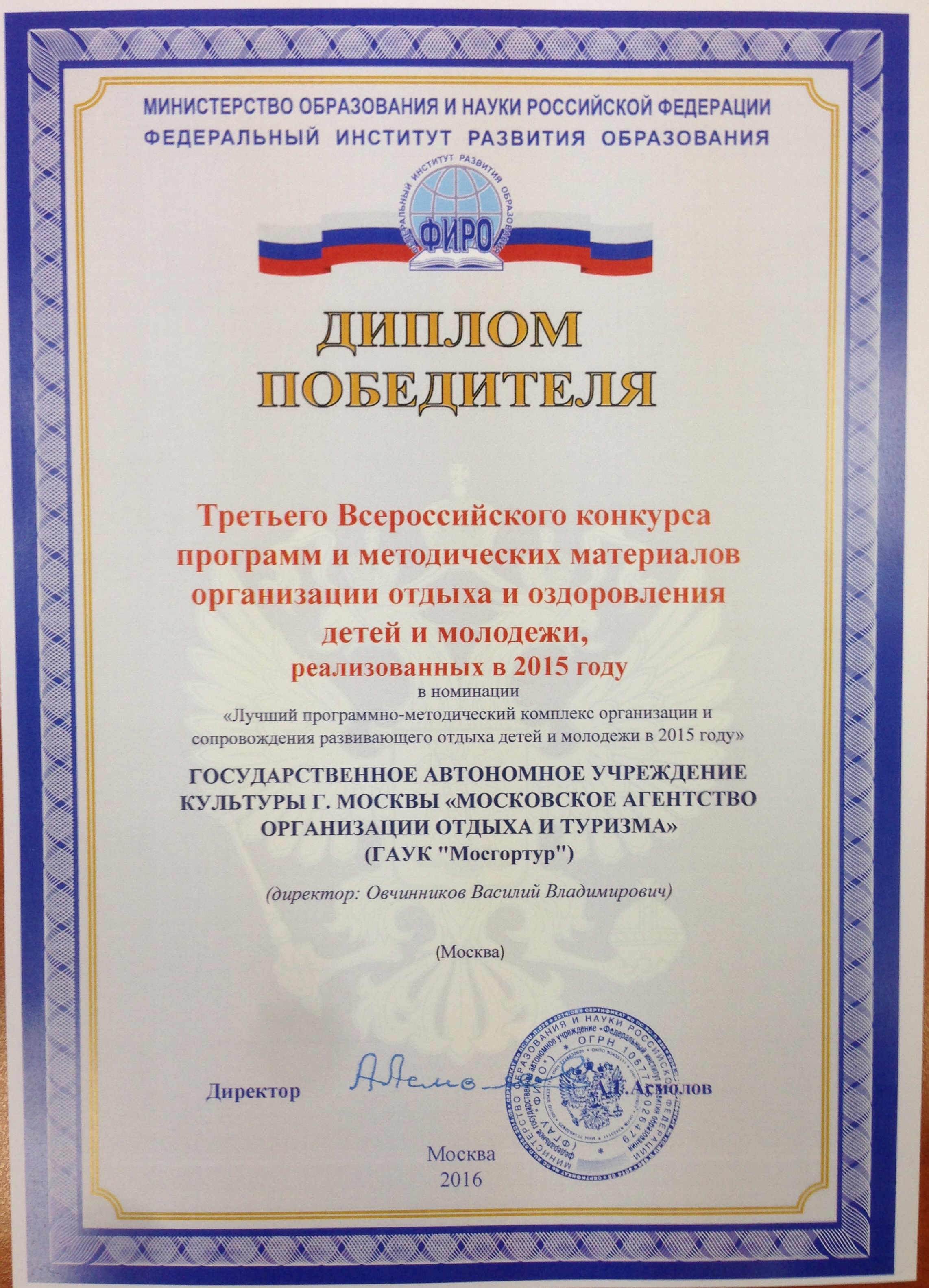 МОСГОРТУР стал победителем III Всероссийского конкурса программ и методических материалов в номинации «Лучший программно-методический комплекс организации и сопровождения развивающего отдыха детей и молодежи в 2015 году».