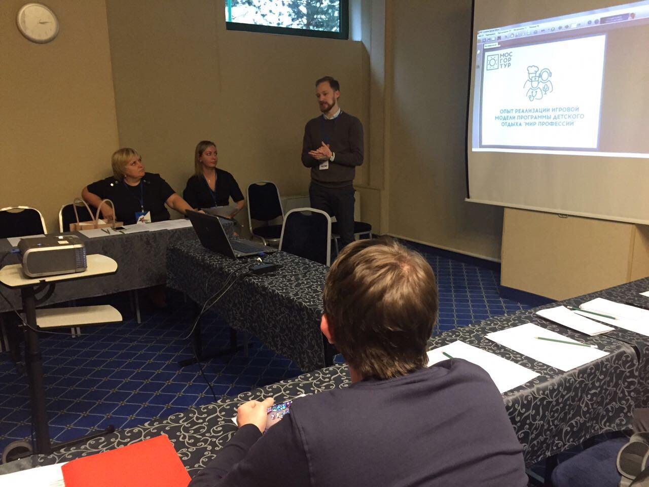 На семинаре-совещании «Профориентационные игры в лагере» Александр Сметанин, менеджер Отдела программ детского отдыха МОСГОРТУРа, познакомил участников конференции с программой отдыха «Мир профессий». Во время смены дети пробуют свои силы в разных профессиях, проходят профориентационную диагностику и знакомятся с работами будущего. Кроме того, участники программы закрепляют полученные знания на специальных мероприятиях: ток-шоу, интеллектуальном поединке, пресс-конференции, аукционе и мастер-классах.