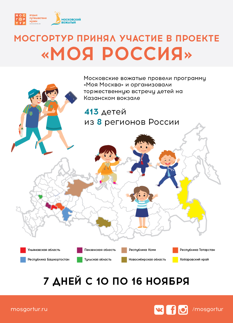 С 10 по 16 ноября вожатые МОСГОРТУРа проводили специальную анимационную программу для участников проекта «Моя Россия». Всего «московские вожатые» провели занятия для 413 детей из восьми регионов России, в том числе из Татарстана, Ульяновской области и Хабаровского края. С каждой группой детей работали по десять вожатых.