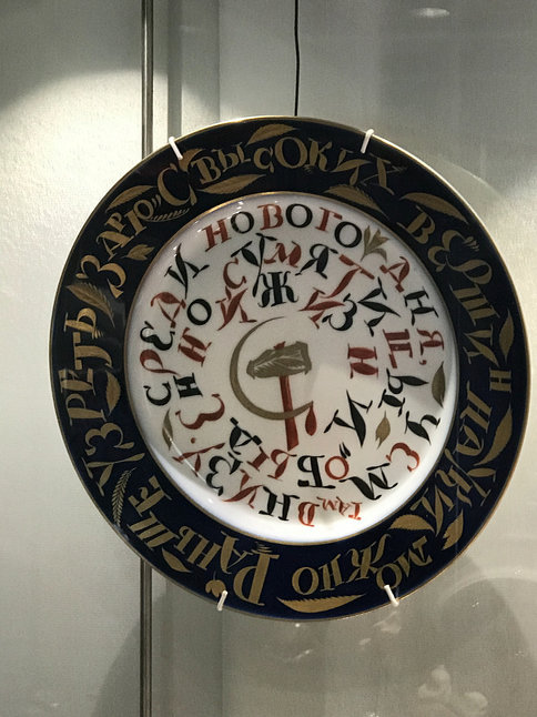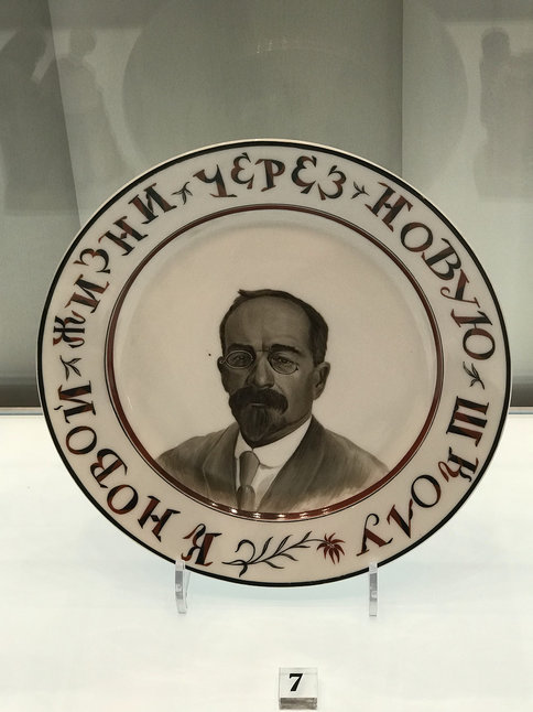 Впечатляет собрание агитационного фарфора первых лет Советской власти - настоящее украшение выставки. Об этом явлении нужно сказать особо.