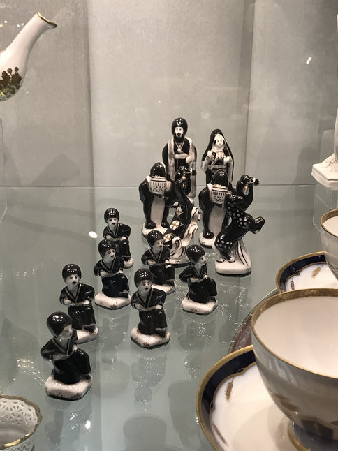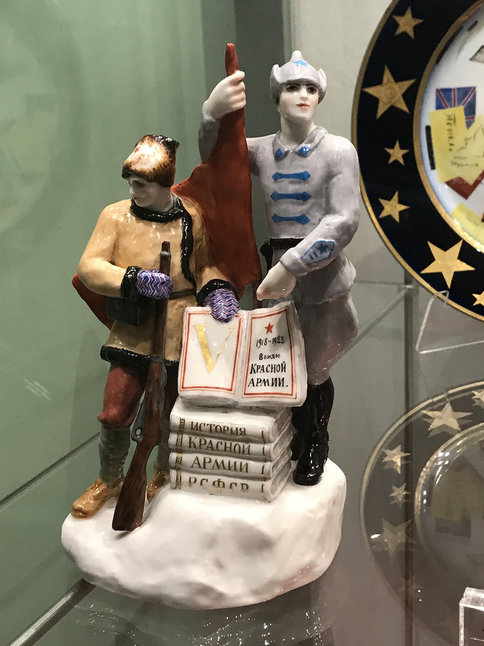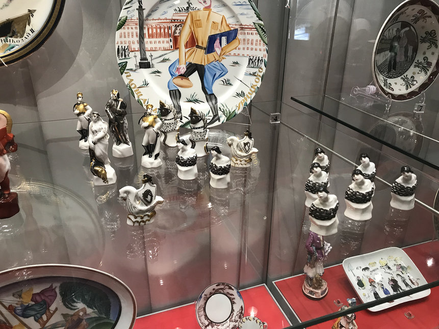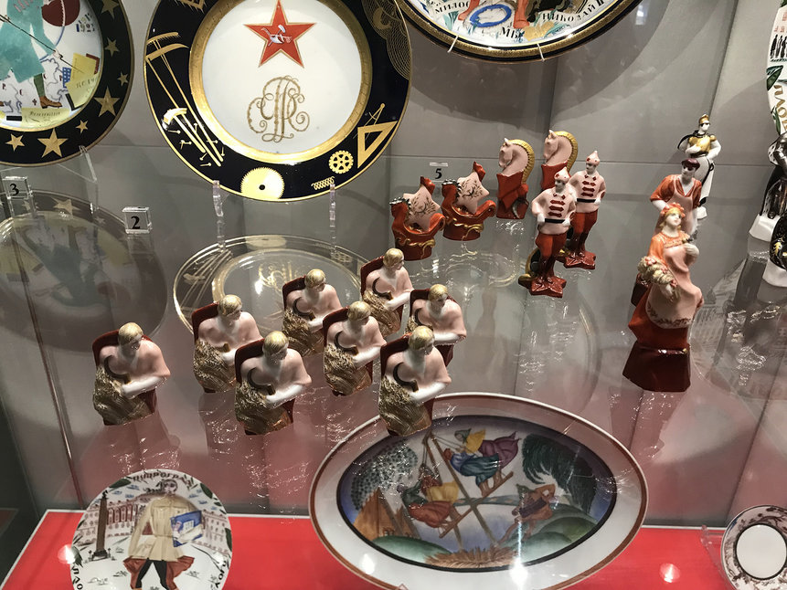 И шахматы как символ Гражданской войны, и удивительные чехонинские тарелки с эмблемами Страны Советов, и многочисленные статуэтки с красногвардейцами, матросами, рабочими и крестьянами – всё это фарфоровое богатство представлено на выставке.