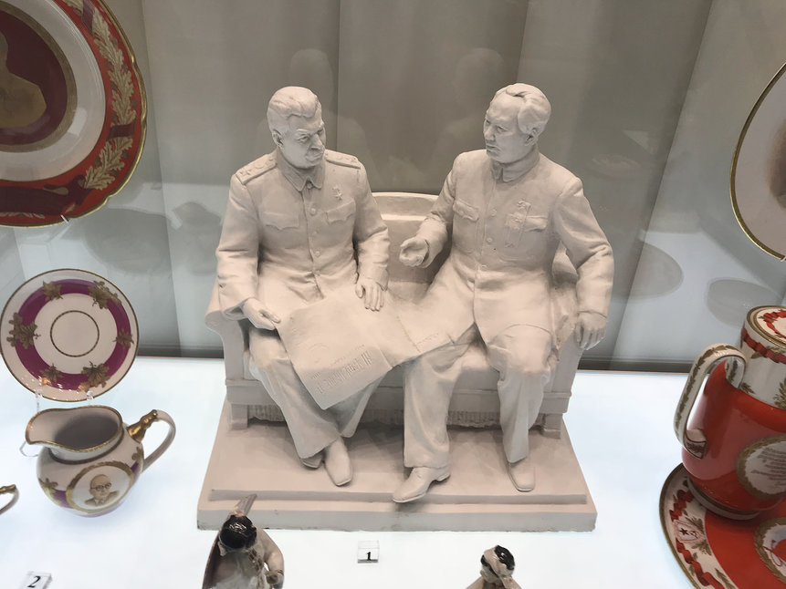 На выставке довольно много разномасштабных изображений Иосифа Сталина – от миниатюрной статуэтки голосующего генералиссимуса до его фигуры почти в полный рост. Особняком стоит парная скульптура Сталина вместе с «Великим кормчим» Китая Мао Цзэдуном, рассказывающая о встрече двух мировых лидеров в Москве зимой 1949-1950 годов.