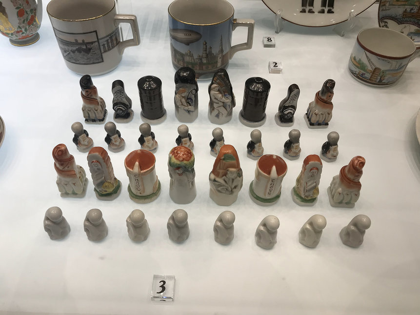 Интересна тема фарфоровых шахмат. Кроме уже упоминавшихся «Красных и белых» Данько, любопытно взглянуть на два набора фигур 1930-х годов. Оба были выполнены скульптором Елизаветой Трипольской. В первом, получившем название «Индустриализация и сельское хозяйство», ладьи превратились в силосные башни и газгольдеры, ферзи – в сборщицу урожая и женщину-шофёра, а короли – в тракториста и шахтёра. Другая её работа, «Туркменские шахматы», более традиционна, просто большинство фигур получило восточное прочтение – например, вместо слонов на шахматной доске появились верблюды.