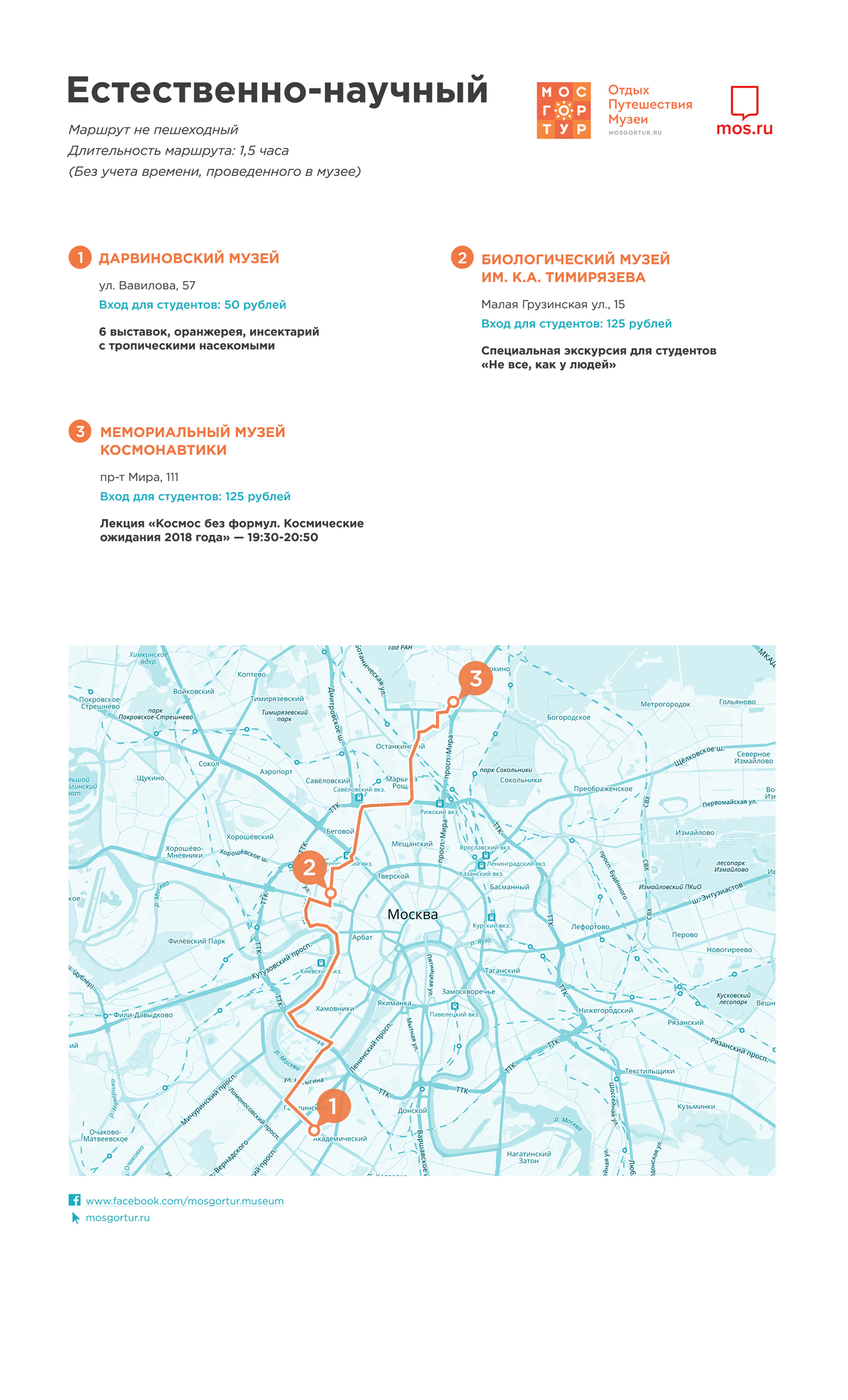 Естественно-научный маршрут пройдет от улицы Вавилова до проспекта Мира. Сначала студентам предлагают посетить Дарвиновский музей, где сейчас открыто шесть выставок. Посетители увидят тропических скорпионов и паука-птицееда, а также узнают, как создать оранжерею в домашних условиях. Затем маршрут приведет в Биологический музей имени К.А. Тимирязева на Малой Грузинской улице. Там студентам расскажут о разных способах размножения животных, растений и грибов. Завершится прогулка в Мемориальном музее космонавтики. Добраться до него можно будет на метро. В музее состоится лекция «Космос без формул. Космические ожидания 2018 года». Гости музея узнают, какие новые ракеты и космические корабли выйдут на орбиту в ближайшее время и какие новые точки Вселенной будут изучать при помощи межпланетных зондов. Маршрут для студентов естественно-научных специальностей самый долгий из трех. Он займет около полутора часов, не считая времени, проведенного в самих музеях.