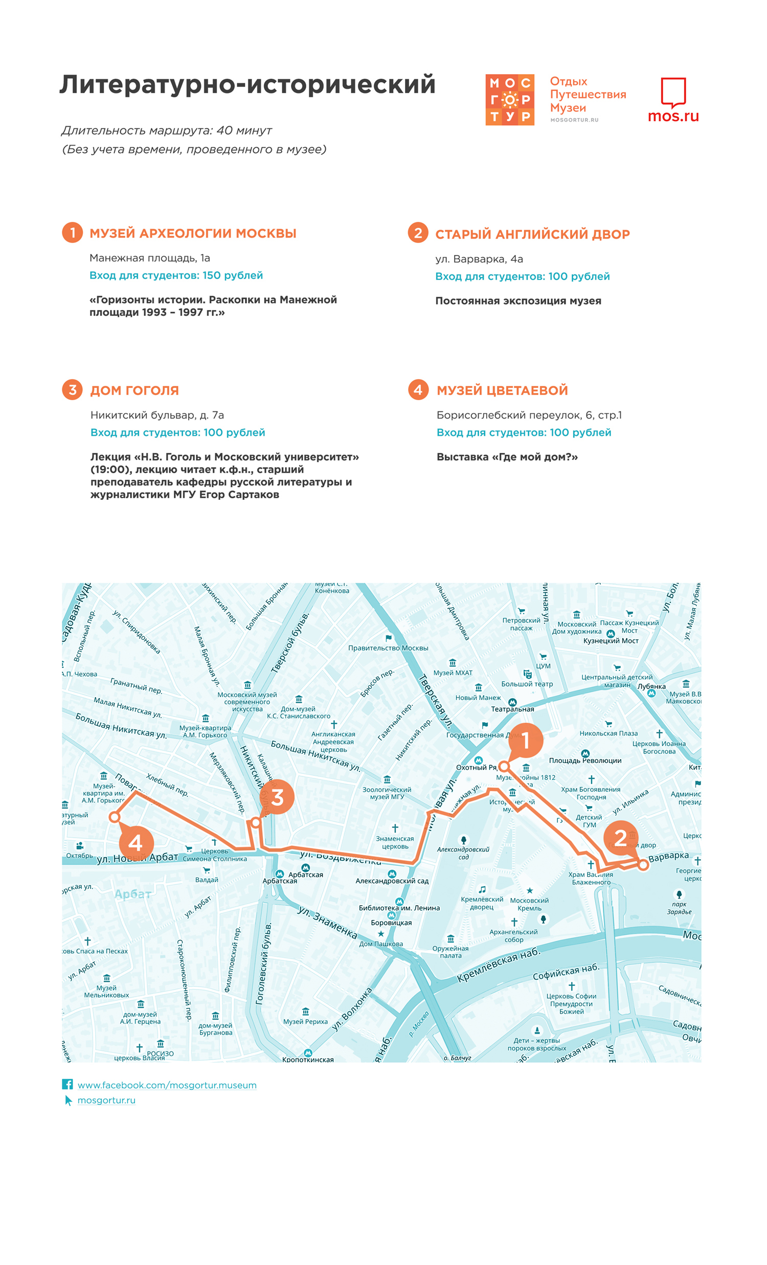 Литературно-исторический маршрут начнется на Манежной площади и закончится в Борисоглебском переулке. В первую очередь студенты посетят Музей археологии Москвы, где проходит выставка «Горизонты истории. Раскопки на Манежной площади 1993–1997 годов». Они познакомятся с особенностями городской археологии. Им также расскажут о проводимых в последние годы раскопках и о том, какие работы пройдут в ближайшее время. Затем все желающие могут попасть в Старый Английский Двор на улице Варварке, где они узнают о жизни английского купеческого дома в XVI–XVII веках.