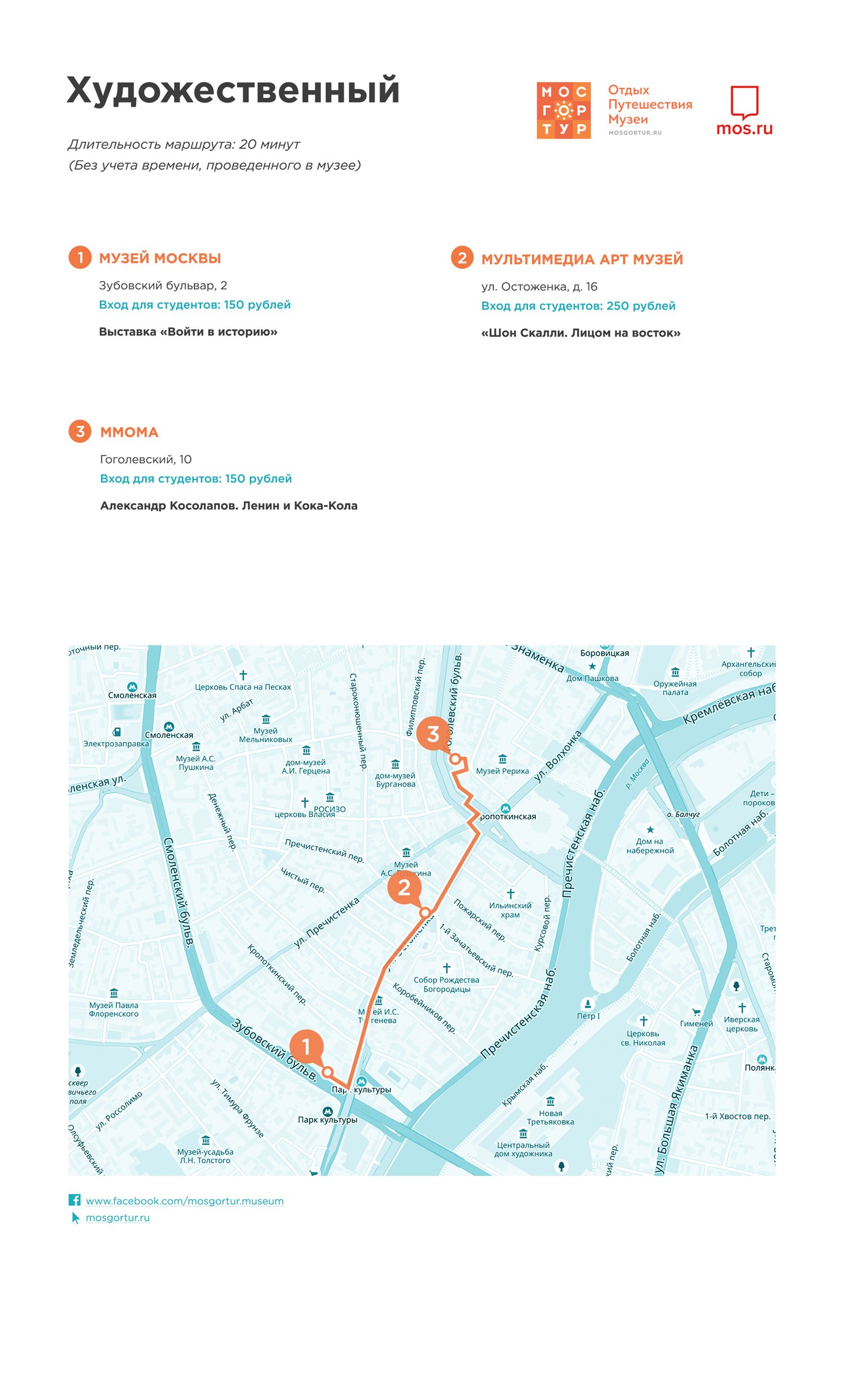 Третий — художественный — маршрут начнется в Музее Москвы на Зубовском бульваре. Студентам предлагают посетить выставку «Войти в историю». Здесь представлены работы уличных художников. Затем учащиеся посетят выставку картин классика абстракции Шона Скалли в «Мультимедиа-арт-музее» на Остоженке. Закончится прогулка на выставке русско-американского художника, пионера соц-арта Александра Косолапова в Московском музее современного искусства на Гоголевском бульваре. Общее время в пути между выставками третьего маршрута займет примерно 20 минут.