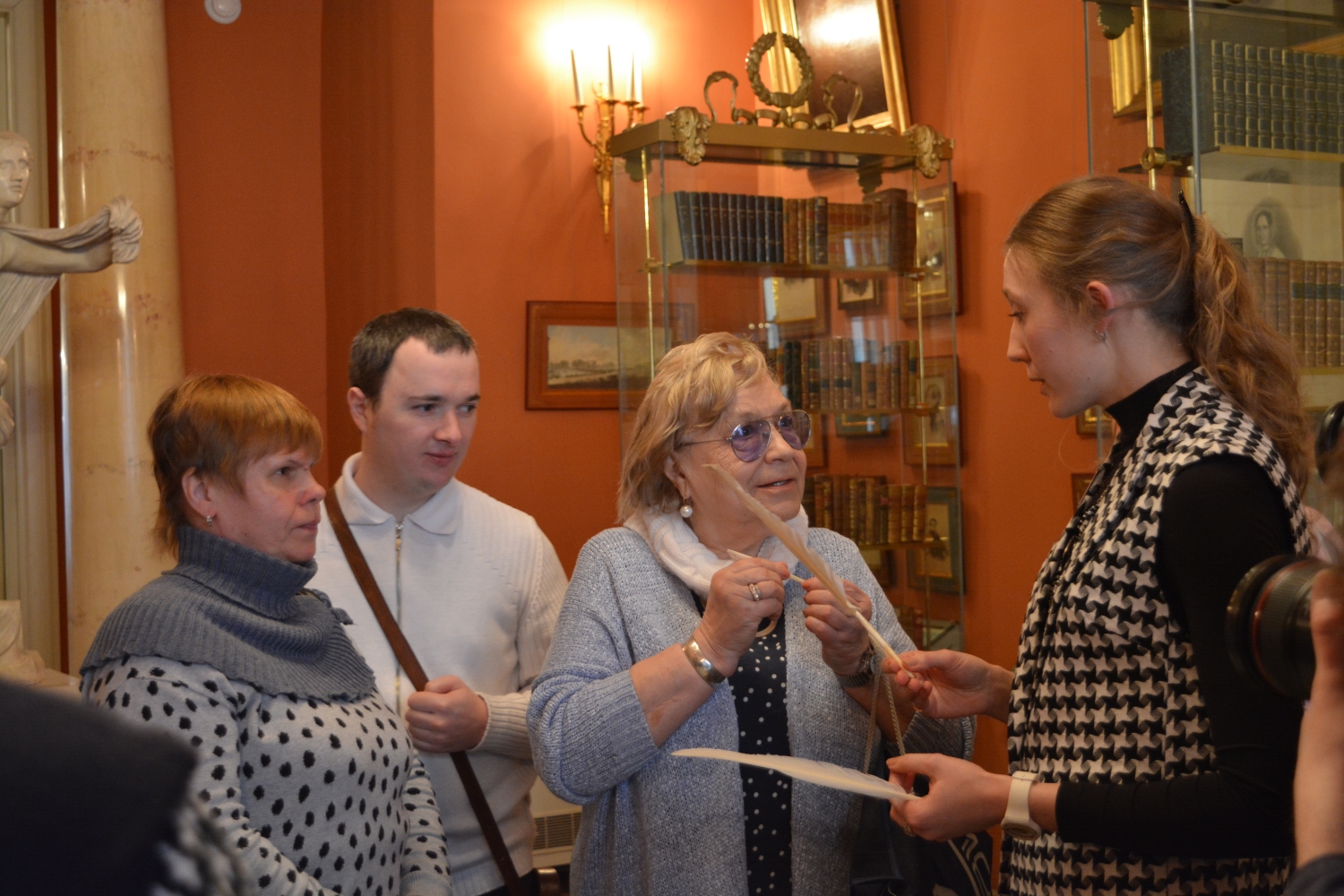 Сегодня в Государственном музее А.С. Пушкина прошла экскурсия для группы людей с нарушением зрения. Экскурсия была посвящена жизни Пушкина и культуре «золотого века» и сопровождалась осмотром тактильных экспонатов: портрета Наталья Гончаровой, бисерных вышивок, гусиных перьев и чернильницы XIX века, а также посмертной маски А.С. Пушкина.