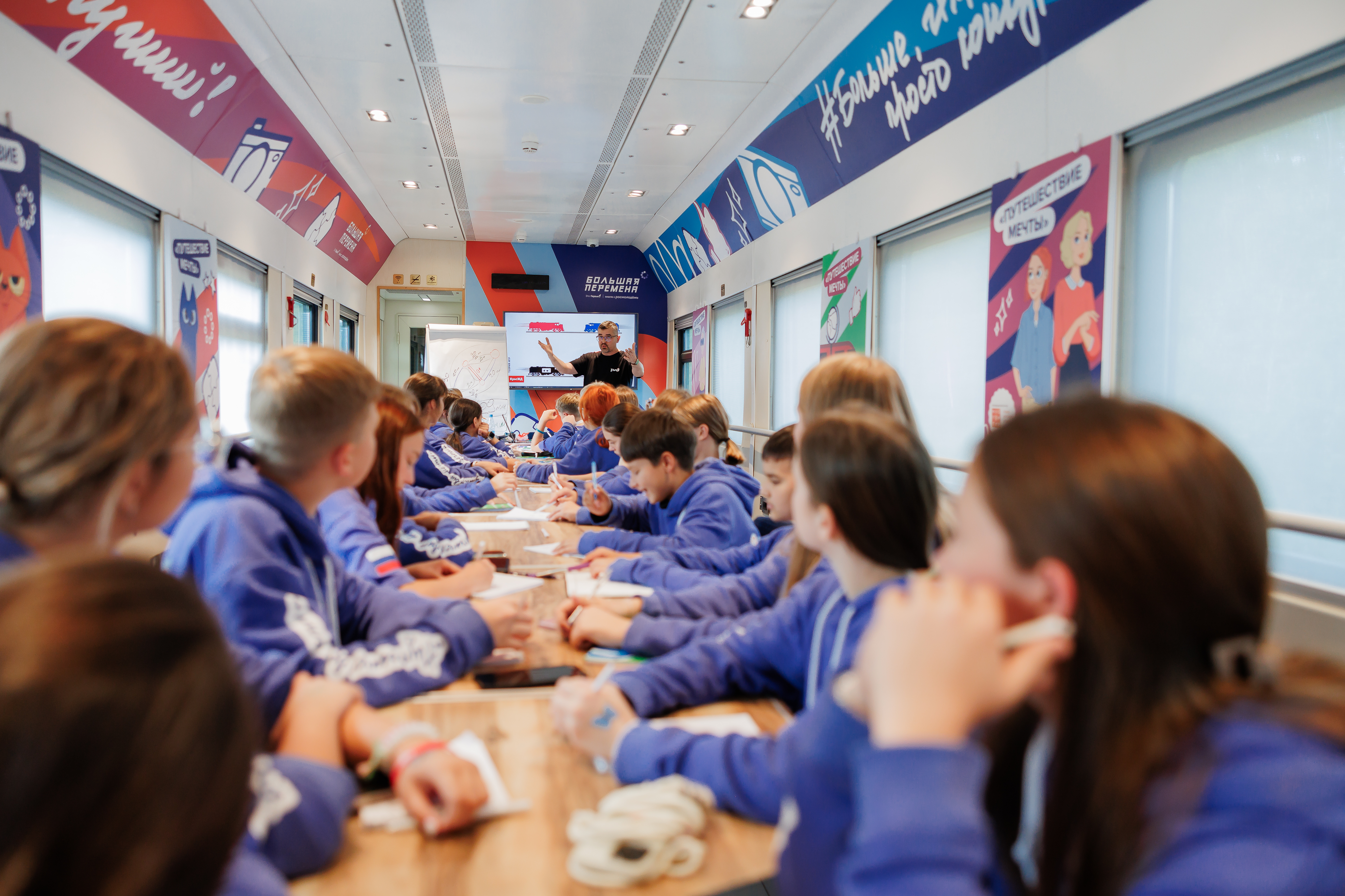 Во время путешествия в специальном вагоне-лектории для ребят проходили лекции, мотивационные встречи и мастер-классы от экспертов в разных сферах. А в вагоне-медиастудии победители конкурса делились впечатлениями от путешествия.